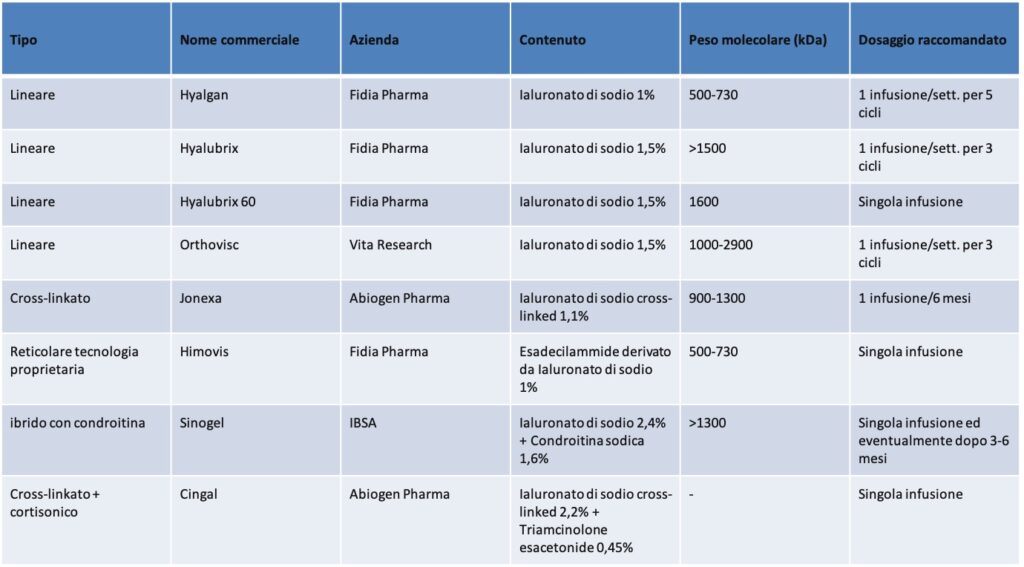 Di seguito una semplice tabella riassuntiva sui tipi di acidi ialuronici, modalità di somministrazione ed effetti.