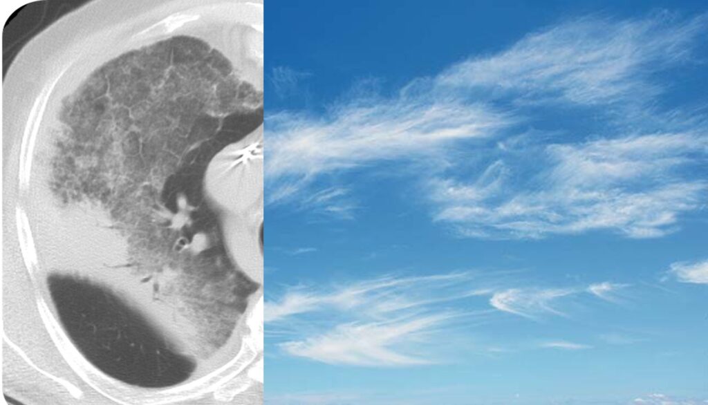 Pattern reticolare liscio 1. Edema polmonare interstiziale Cos’è: accumulo di liquido nell’interstizio polmonare, spesso causato da insufficienza cardiaca Ispessimento liscio di setti interlobulari, GGO; possibile crazy