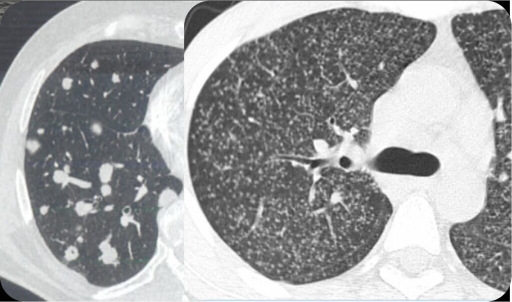 Pattern nodulare Il pattern nodulare è caratterizzato dalla presenza di noduli che possono variare per dimensione, distribuzione e densità. I noduli rappresentano addensamenti focali del