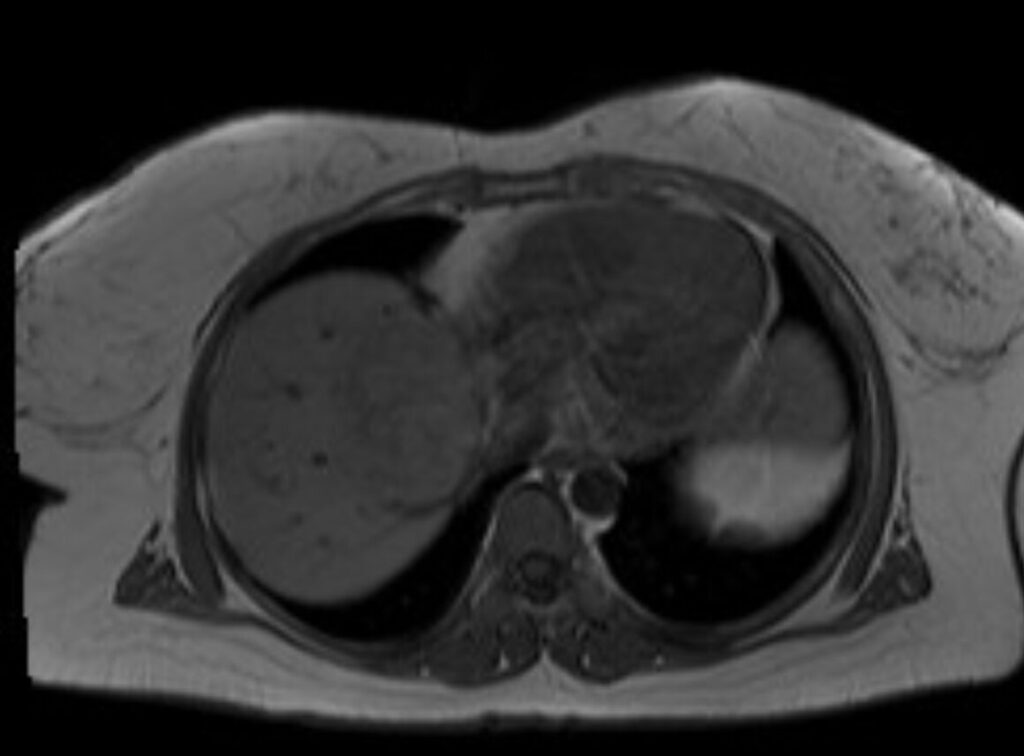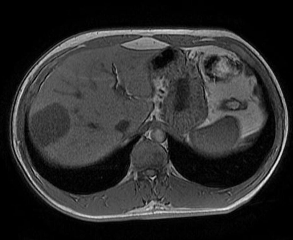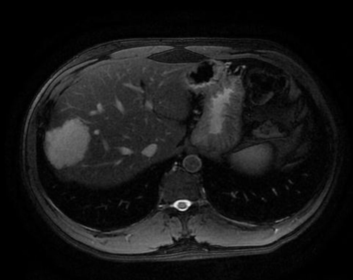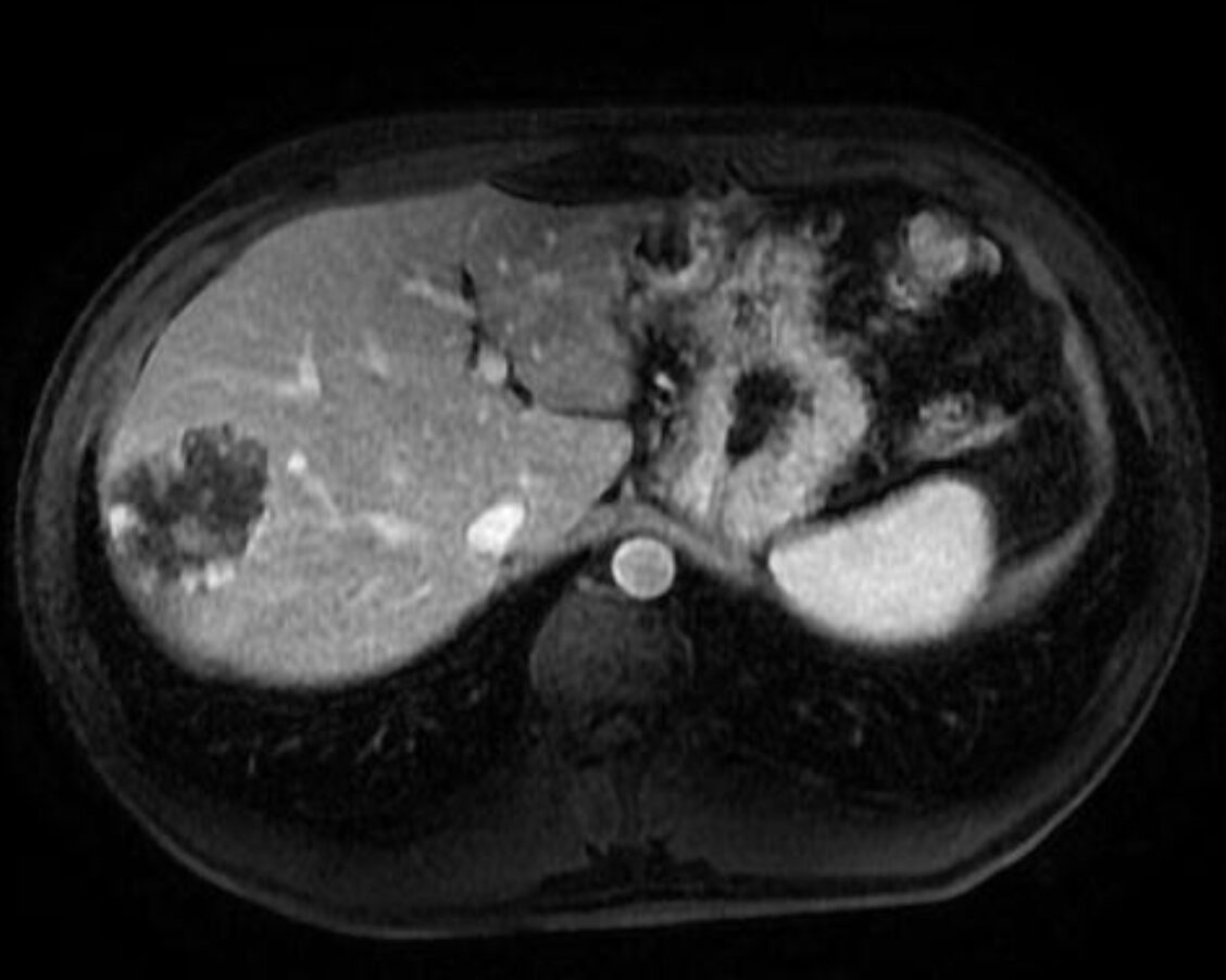 - Con mutazione della β-catenina (β-HCA): più frequente nel sesso maschile. Alto rischio di trasformazione maligna (6%). Caratterstica RM: segnale eterogeneo in T1 e T2, talvolta con scar centrale.+