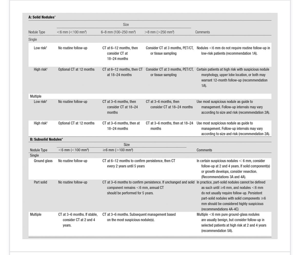 I criteri della Fleischner Society (dimensione, nodulo singolo/ multiplo, nodulo solido/ subsolido/ a vetro smerigliato) stabiliscono il follow up per il nodulo polmonare, a 3 mesi per i casi più a rischio. Sono esclusi dai criteri della Fleischner Society i pazienti con età inferiore ai 35 anni, i pazienti non immunocompetenti ed i pazienti con tumore polmonare primitivo.